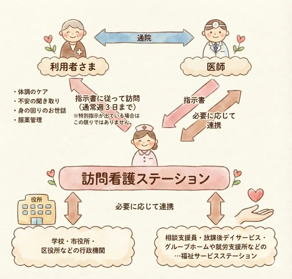訪問看護とは、医師の指示に基づいて看護師やリハビリ専門職などが自宅等を訪問し、療養上の世話や医療的ケアを提供する在宅サービスです。病気や障がいがあっても、住み慣れた家でその人らしく生活できるよう支援することが目的です。